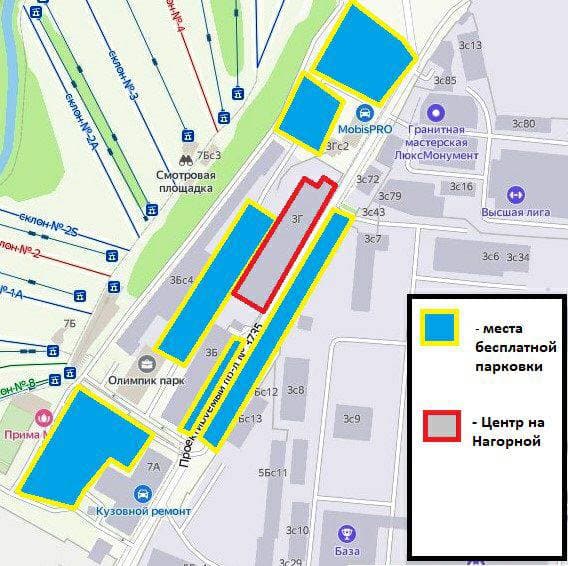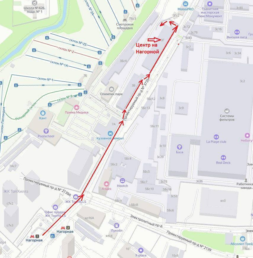 1) На метро: • Серая ветка метро, станция Нагорная. • Выход на улицу №1. •15 минут пешком по стрелочкам на схеме N1