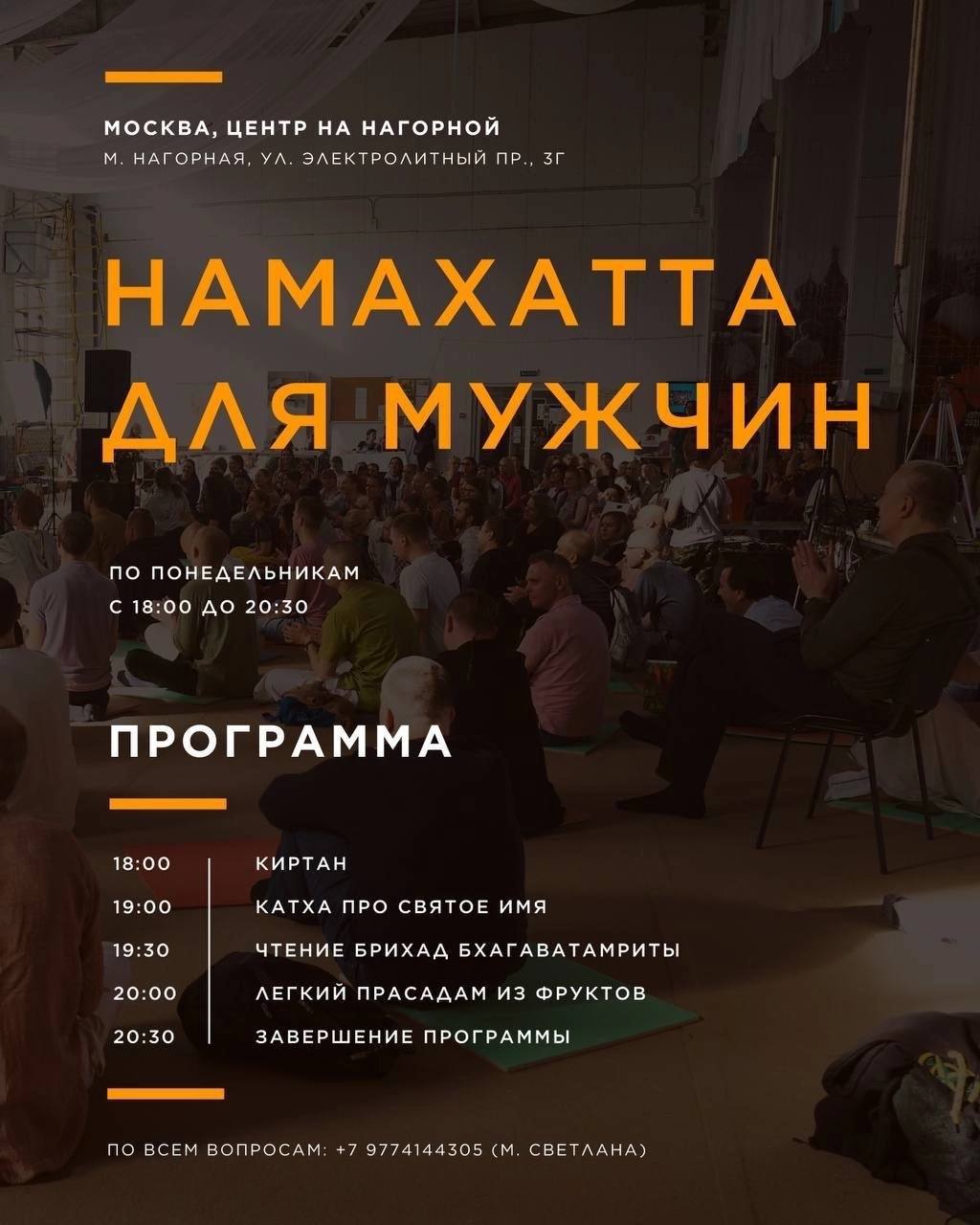 Приглашаем мужчин из любых ашрамов. Возраст не ограничен. Место проведения: Центр на Нагорной, стеклянная комната По понедельникам с 18:00 до 20:30.