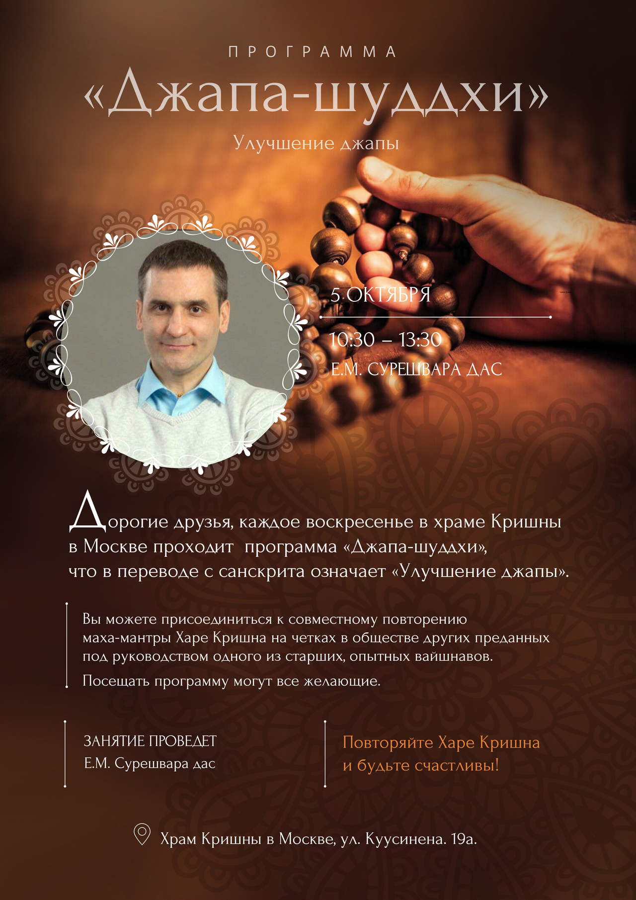 Мы рады пригласить вас на занятие по мантра-медитации «Джапа-шуддхи». Оно пройдёт в воскресенье, 5 октября, с 10:30 до 13:30.