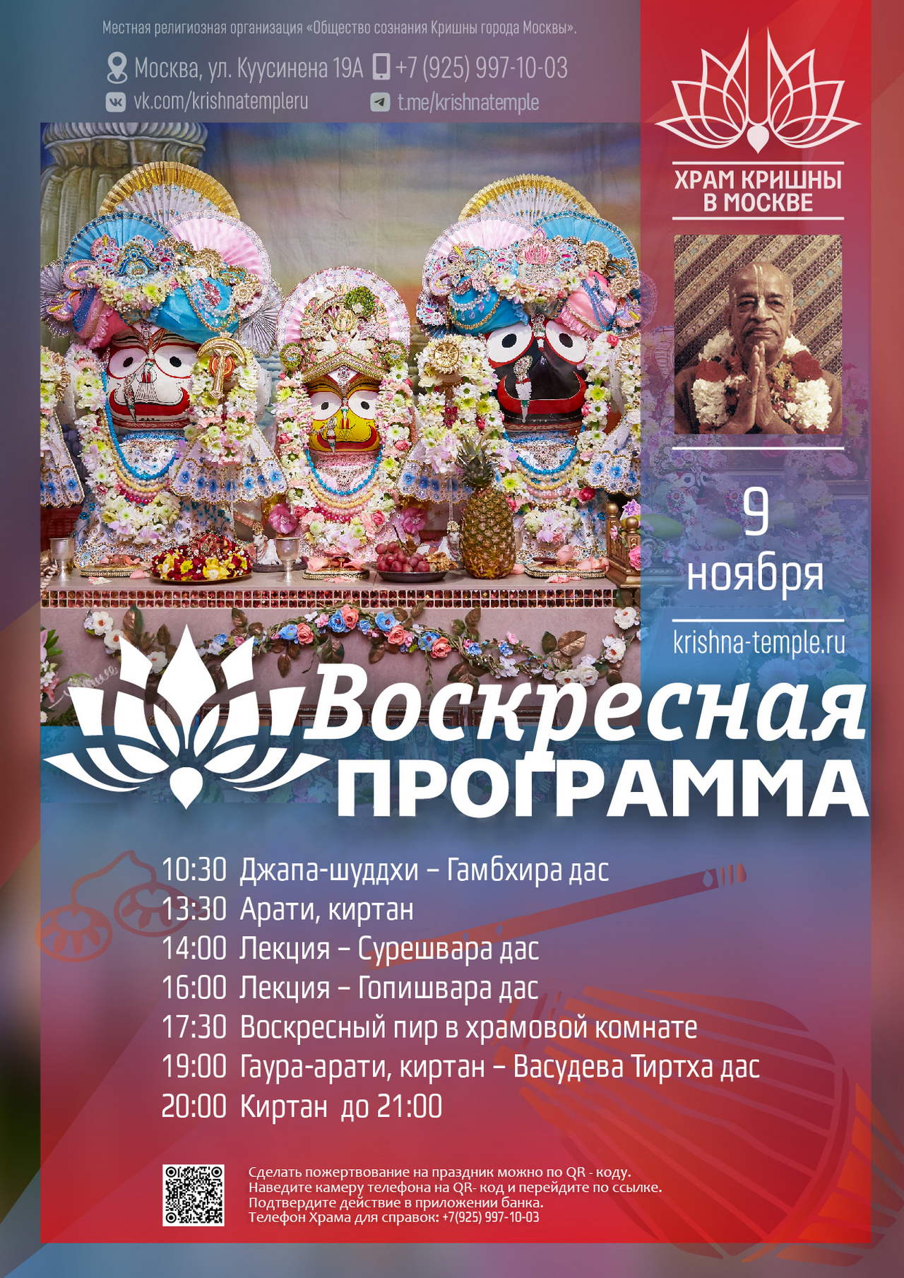 2. Воспользоваться сервисом онлайн-пожертвований на сайте Храма => https://d.krishna-temple.ru/ 3. Или через Систему быстрых платежей по номеру: