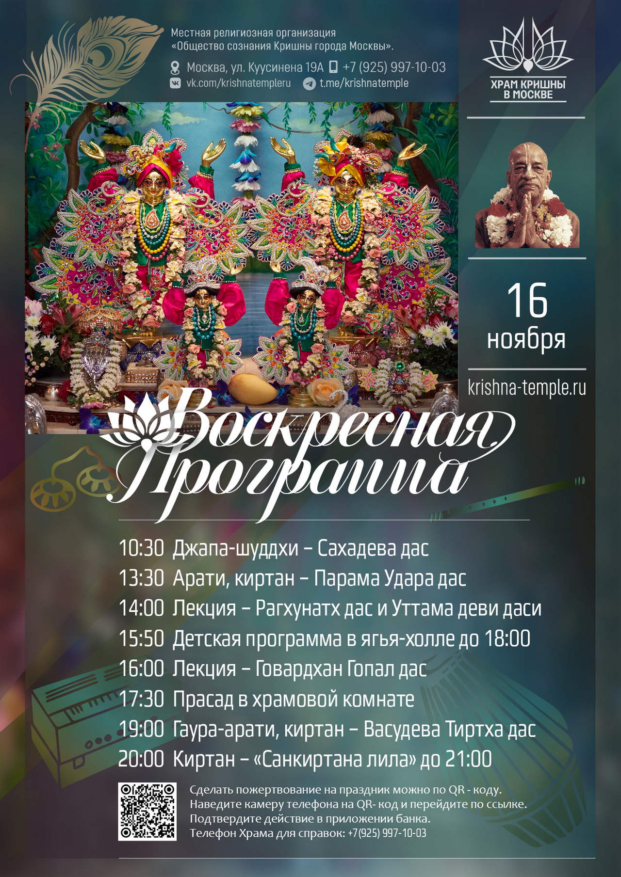 2. Воспользоваться сервисом онлайн-пожертвований на сайте Храма => https://d.krishna-temple.ru/ 3. Или через Систему быстрых платежей по номеру: