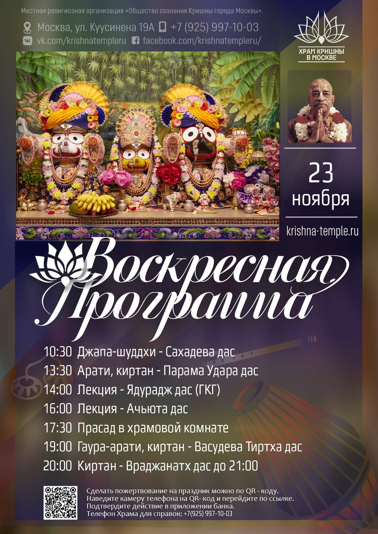 2. Воспользоваться сервисом онлайн-пожертвований на сайте Храма => https://d.krishna-temple.ru/ 3. Или через Систему быстрых платежей по номеру: