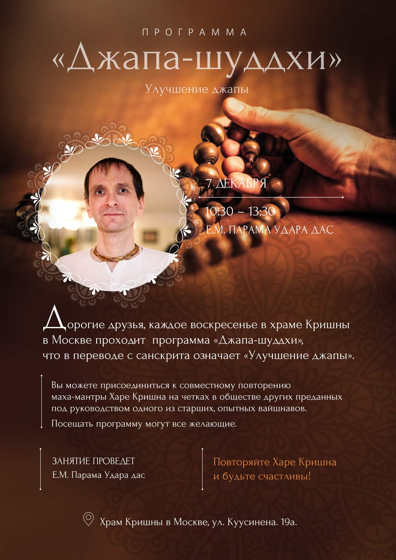 | 💥 Харе Кришна! Дорогие вайшнавы, приглашаем вас на воскресное занятие по улучшению джапы "Джапа-шуддхи", которое состоится 7 декабря с 10:30 до 13:30.