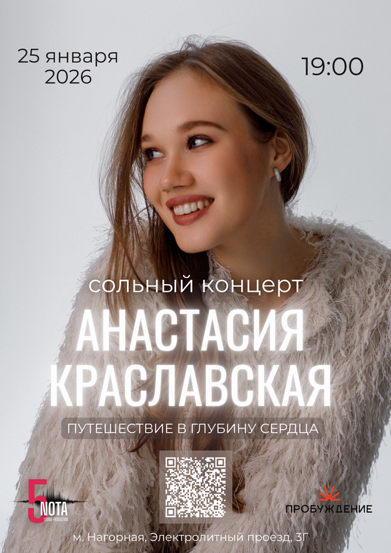 «Путешествие вглубь сердца» — концерт-терапия от певицы и актрисы Театра у Никитских ворот Анастасии Краславской. Синтез красивой музыки (баллады, рок, поп-соул), глубинной лирики и теплой атмосферы, созданной для внутренних открытий.