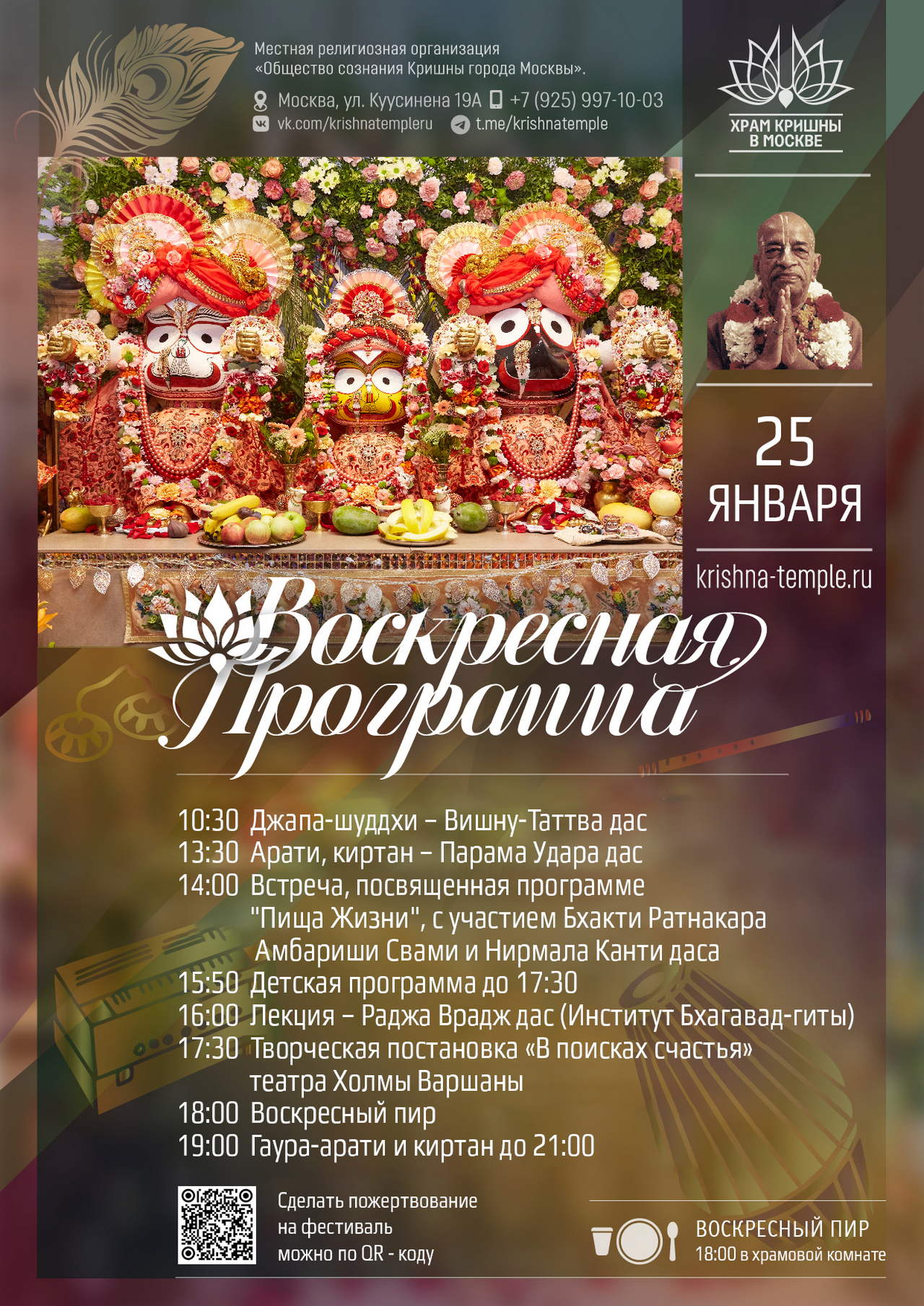 Наименование организации: Местная религиозная организация "Общество сознания Кришны города Москвы" ИНН: 7733190429 КПП: 771401001 ОГРН: 1117799025497 Расчётный счёт: 40703 810 7 3800 0003896 Банк получателя: ПАО Сбербанк БИК: 044525225 корр.сч: 30101 810 4 0000 0000225 ИНН: 7707083893 КПП: 773643001 Назначение платежа: "Добровольное пожертвование на уставные цели. НДС не облагается" (Важно! Назначение перевода на расчетный счет храма должно быть только таким).