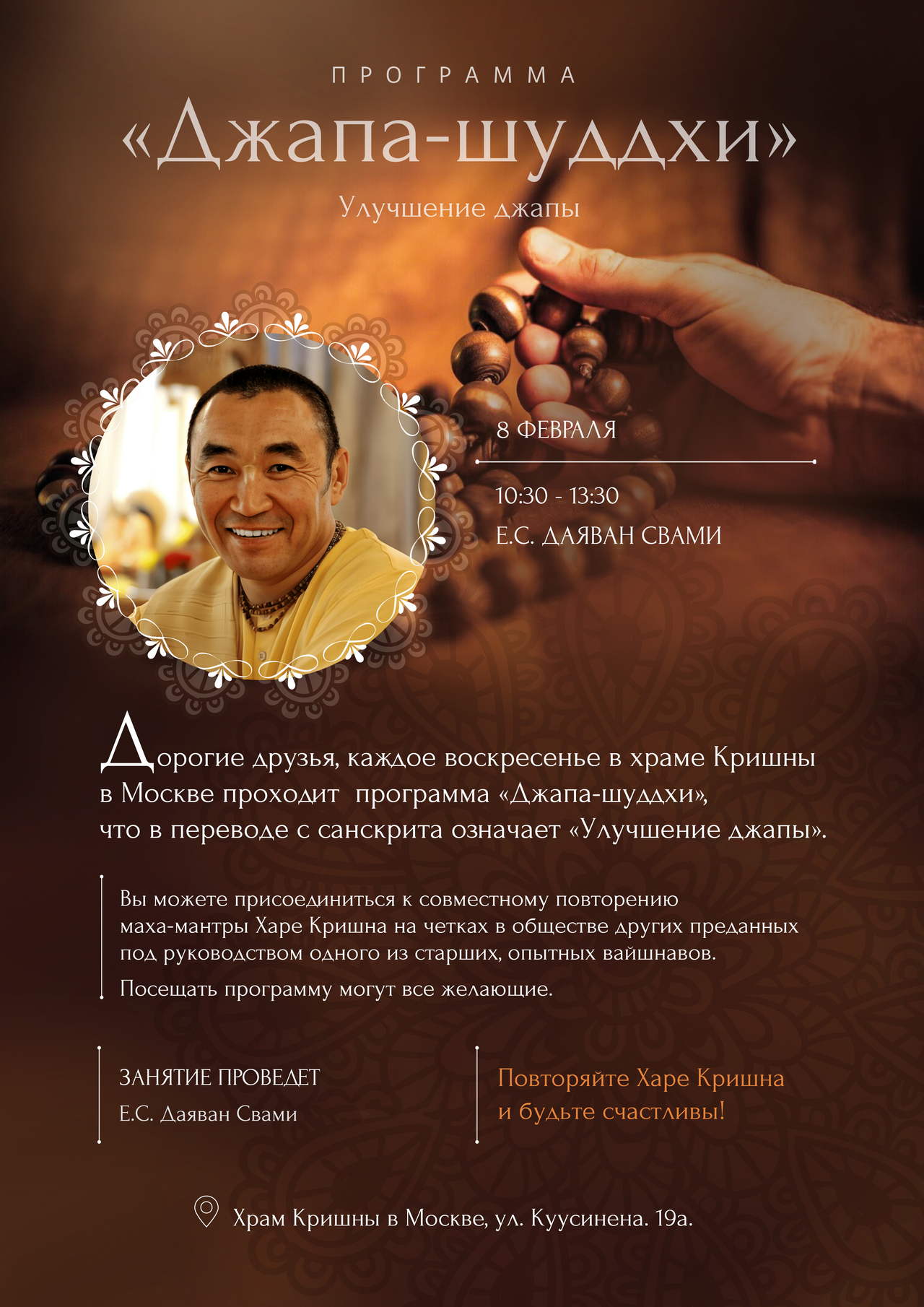 | 💥 Харе Кришна! Дорогие друзья, приглашаем вас на воскресное занятие по улучшению джапы "Джапа-шуддхи", которое состоится 8 февраля с 10:30 до 13:30.
