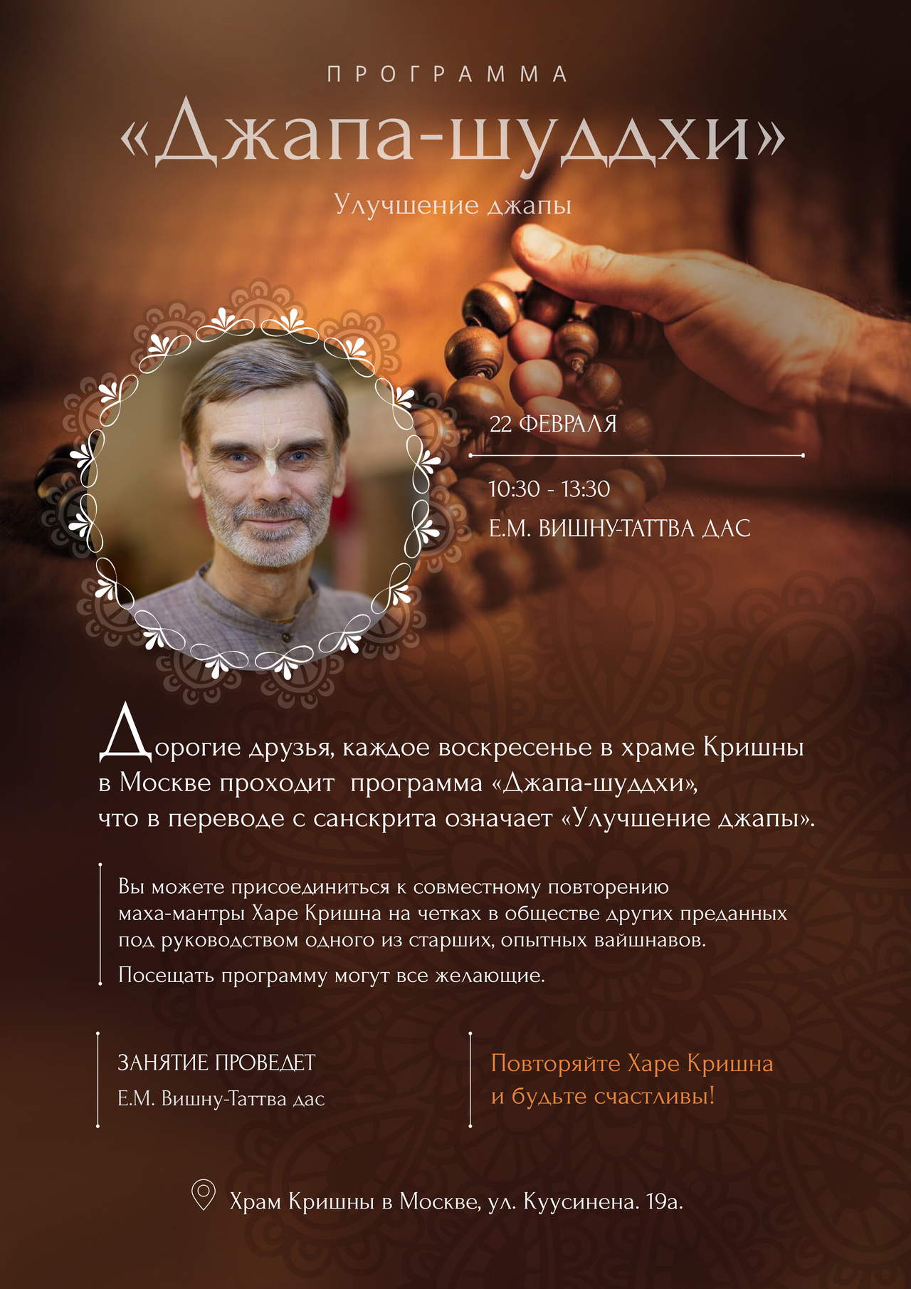 | 💥 Харе Кришна! Дорогие вайшнавы, друзья и гости, приглашаем вас на воскресное занятие по мантра-медитации «Джапа-шуддхи», которое состоится 22 февраля с 10:30 до 13:30. Вы сможете присоединиться к совместному повторению маха-мантры Харе Кришна на четках в обществе других преданных под руководством Е.М. Вишну-Таттвы даса.