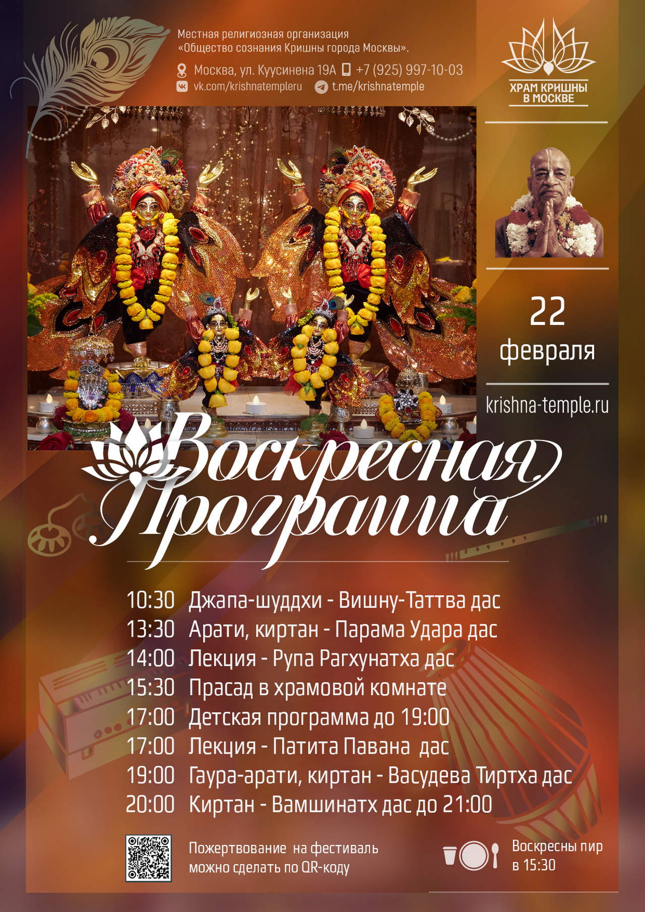Получатель Наименование организации: Местная религиозная организация "Общество сознания Кришны города Москвы" ИНН: 7733190429 КПП: 771401001 ОГРН: 1117799025497 Расчётный счёт: 40703 810 7 3800 0003896 Банк получателя: ПАО Сбербанк БИК: 044525225 корр.сч: 30101 810 4 0000 0000225 ИНН: 7707083893 КПП: 773643001 Назначение платежа: "Добровольное пожертвование на уставные цели. НДС не облагается" (Важно! Назначение перевода на расчетный счет храма должно быть только таким). 😇 Спасибо большое за ваше служение!