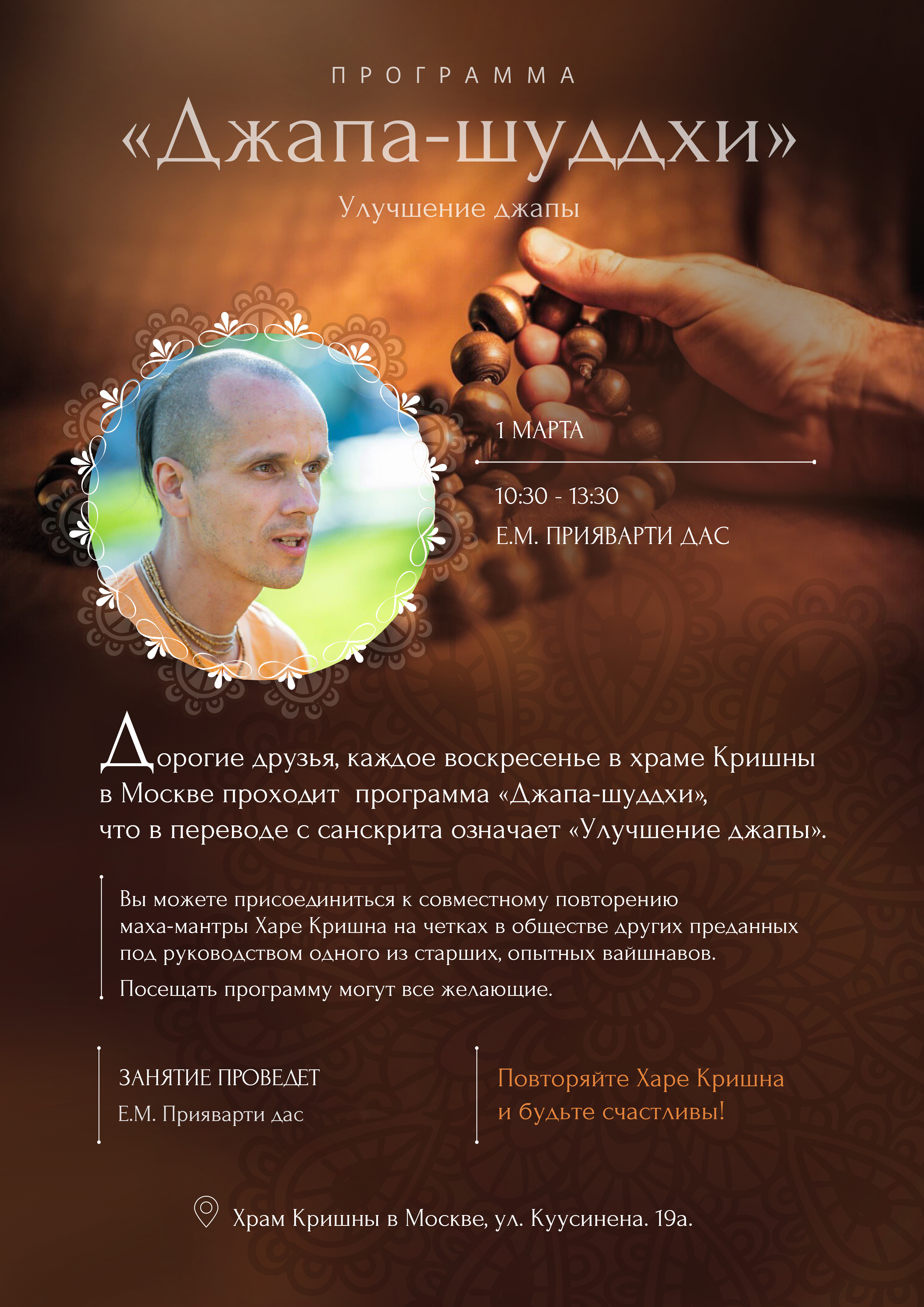 | 💥 Харе Кришна! Дорогие друзья, приглашаем вас на воскресное занятие по мантра-медитации "Джапа-шуддхи". Оно состоится 1 марта с 10:30 до 13:30. Вы сможете присоединиться к совместному повторению маха мантры Харе Кришна на четках в обществе других преданных под руководством Е.М. Прияварти даса.