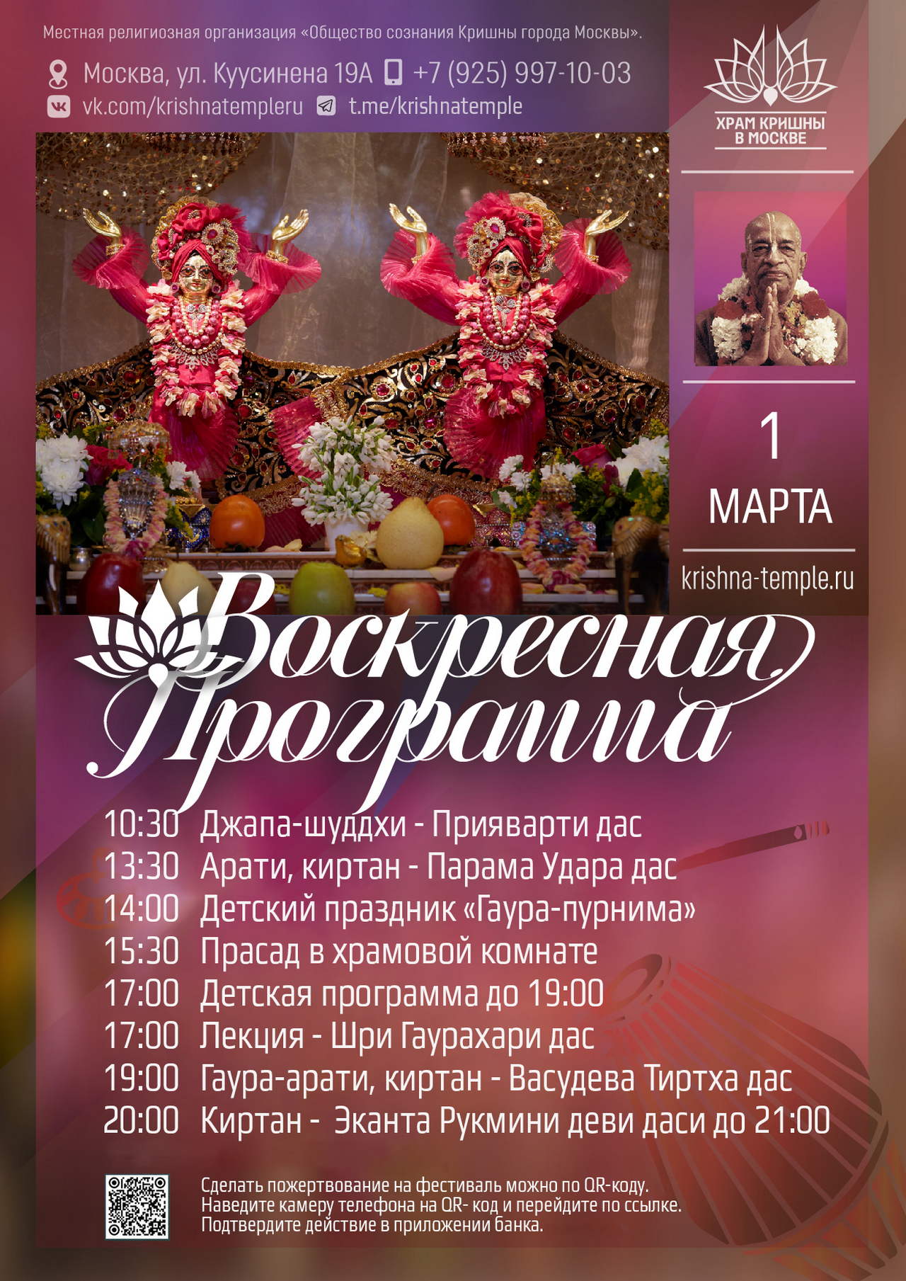 2. Воспользоваться сервисом онлайн-пожертвований на сайте Храма => https://d.krishna-temple.ru/ 3. Или через Систему быстрых платежей по номеру: