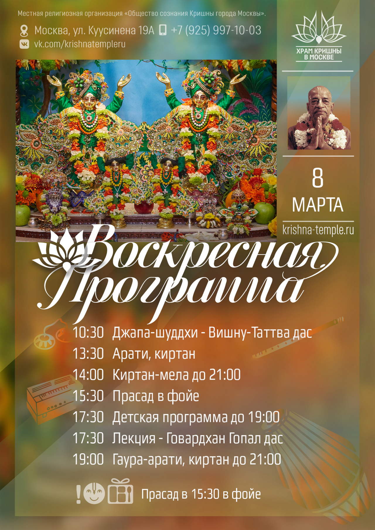 Наименование организации: Местная религиозная организация "Общество сознания Кришны города Москвы" ИНН: 7733190429 КПП: 771401001 ОГРН: 1117799025497 Расчётный счёт: 40703 810 7 3800 0003896 Банк получателя: ПАО Сбербанк БИК: 044525225 корр.сч: 30101 810 4 0000 0000225 ИНН: 7707083893 КПП: 773643001 Назначение платежа: "Добровольное пожертвование на уставные цели. НДС не облагается" (Важно! Назначение перевода на расчетный счет храма должно быть только таким).