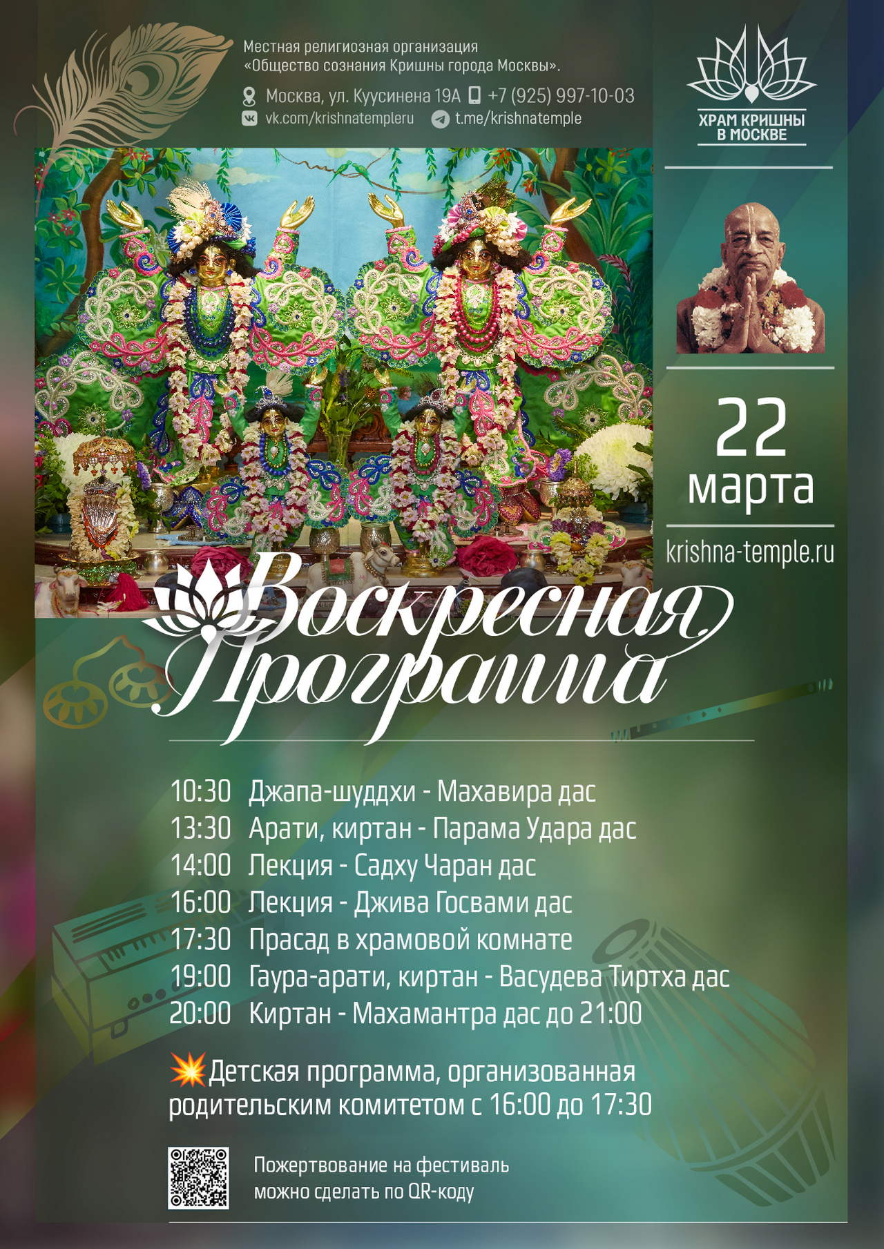 2. Воспользоваться сервисом онлайн-пожертвований на сайте Храма => https://d.krishna-temple.ru/ 3. Или через Систему быстрых платежей по номеру: