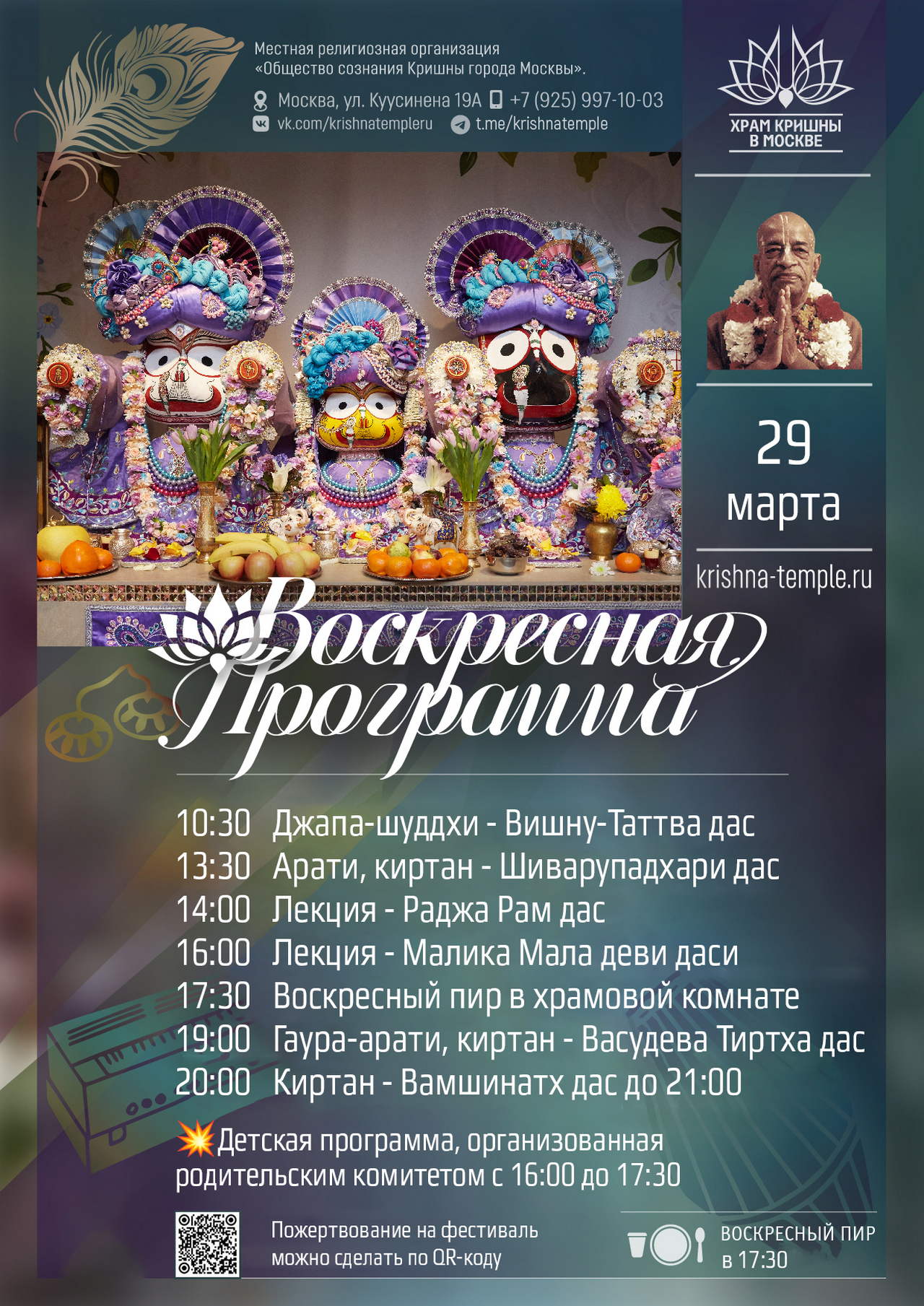 2. Воспользоваться сервисом онлайн-пожертвований на сайте Храма => https://d.krishna-temple.ru/ 3. Или через Систему быстрых платежей по номеру: