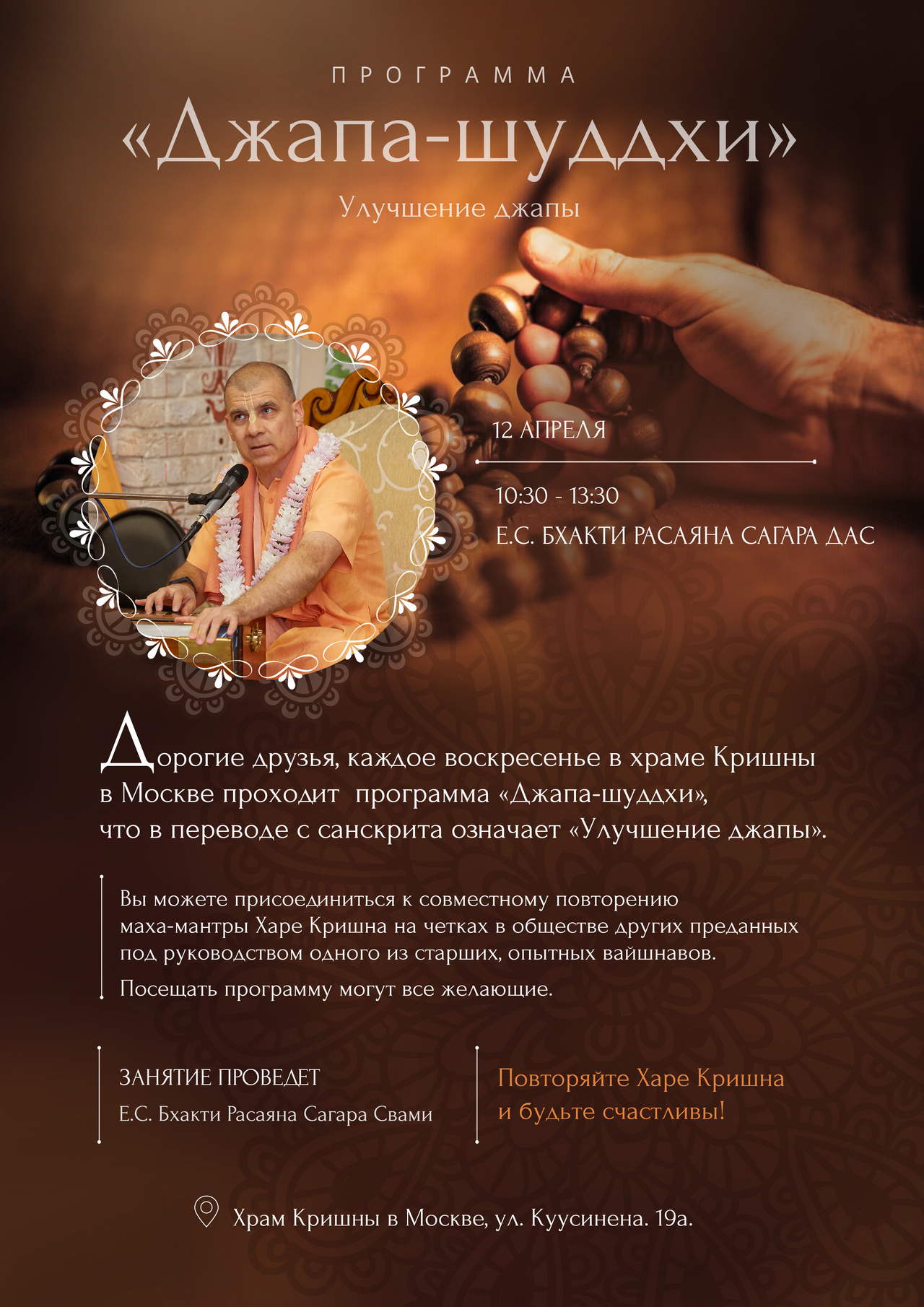🚩 Приходите и присоединяйтесь к совместному повторению Харе Кришна маха-мантры на четках в обществе других преданных под руководством Е.С. Бхакти Расаяны Сагары Свами. 😇 Мы будем рады видеть вас в Храме Кришны на Полежаевской! ул. Куусинена, 19 А.