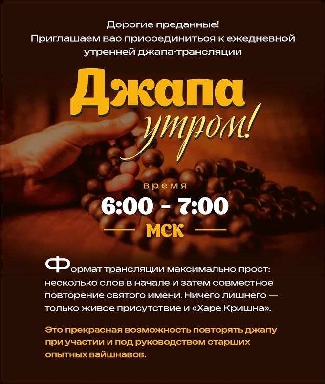 Это объявление носит независимый информационный характер. За достоверность информации, представленной в этом объявлении, как и за последствия предпринятых кем-то действий в связи с этой информацией, ВИОМС и Общество сознания Кришны в г. Москве ответственности не несут.